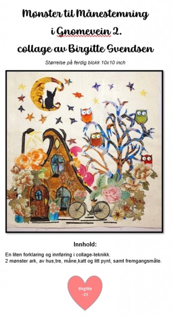 Birgitte: Månestemning i Gnomeveien 2 10x10inch ferdig blokk. En liten forklaring i collage teknikk,2mønster av hus,tre,måne,kattsv..samt fremgangsmåte-sendes som PDF på mail til deg. PrisNOK129,00 inkl. mva. Antall Kjøp Del dette