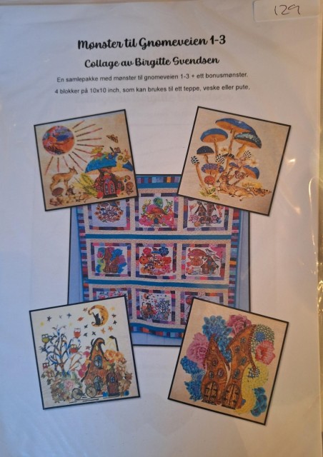 Birgitte: Mønster til Gnomeveien 1-3 en samlepakke med mønster til 1-3 pluss ett bonusmønster,4 blokker av 10x10inch-som kan brukes til teppe,veske, eller pute PrisNOK129,00 inkl. mva. På lager Antall Kjøp Del dette