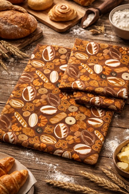 Brød, kringler og andre kaker-brun bunn så morsomt motiv stoff, til forkle, løper og grytelapper PrisNOK140,00 inkl. mva. På lager Antall Kjøp Del dette